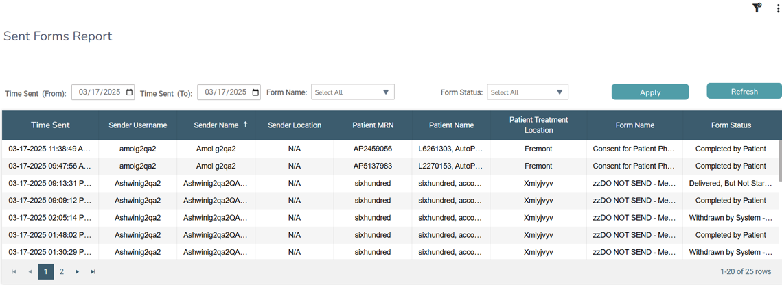 - Displays all sent forms, including those sent to both restricted and non-restricted patients.