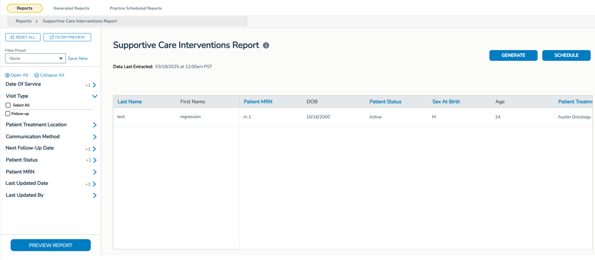 Users with Clinical Support Solution permission can access the Supportive Care Interventions Report. This report provides detailed insights into patient visits and interventions documented in the Supportive Care Interventions section of the Clinical Profile > Patient Hx tab in the patient’s chart.