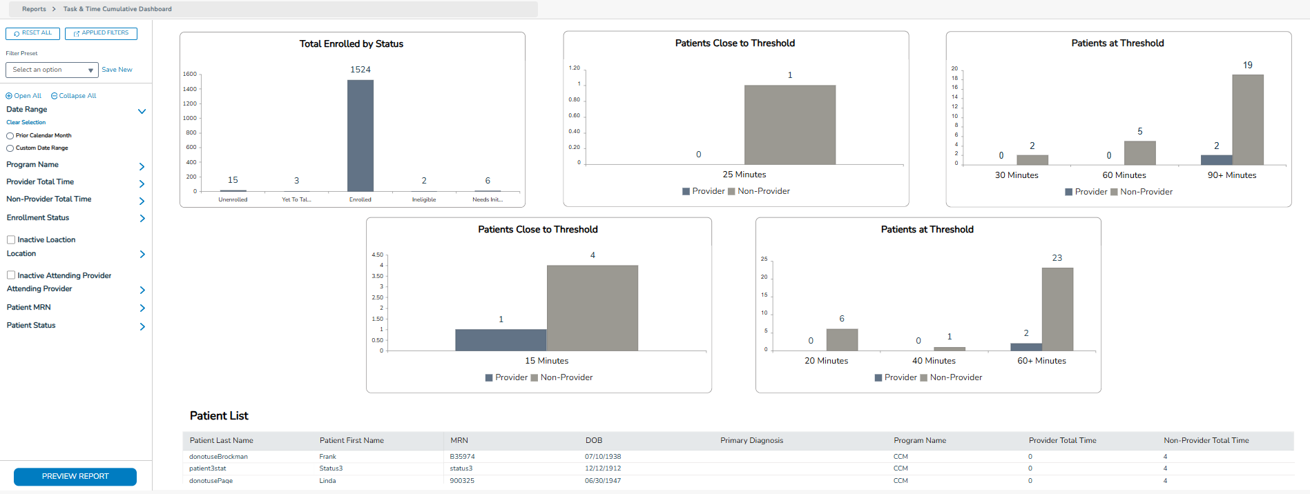 Users with VBC Task Enrollment permission can access the Task & Time Cumulative Dashboard. This dashboard displays the total cumulative time a patient has spent with clinicians in your practice over a selected period, based on entries documented in the Task & Time Capture Report.