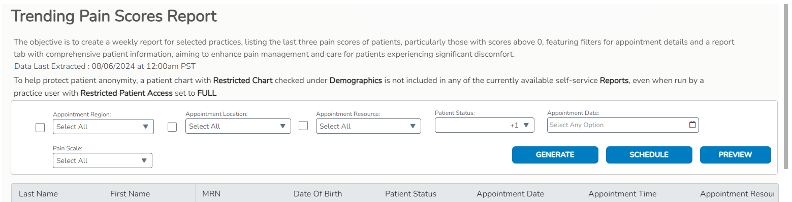 This report provides the last three, recorded pain scores for patients with comprehensive details to support improved pain management. Users can filter the report by appointment details to better target care for patients experiencing significant discomfort.