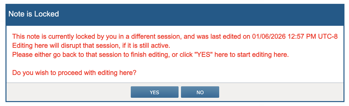 If you click “Yes,” the system will transfer the edit lock to your current session and allow editing to continue.