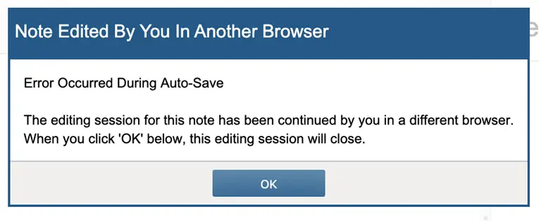 It will also prevent saving or auto-saving in the original session to avoid data loss and display a message in the original session indicating the note is locked elsewhere: