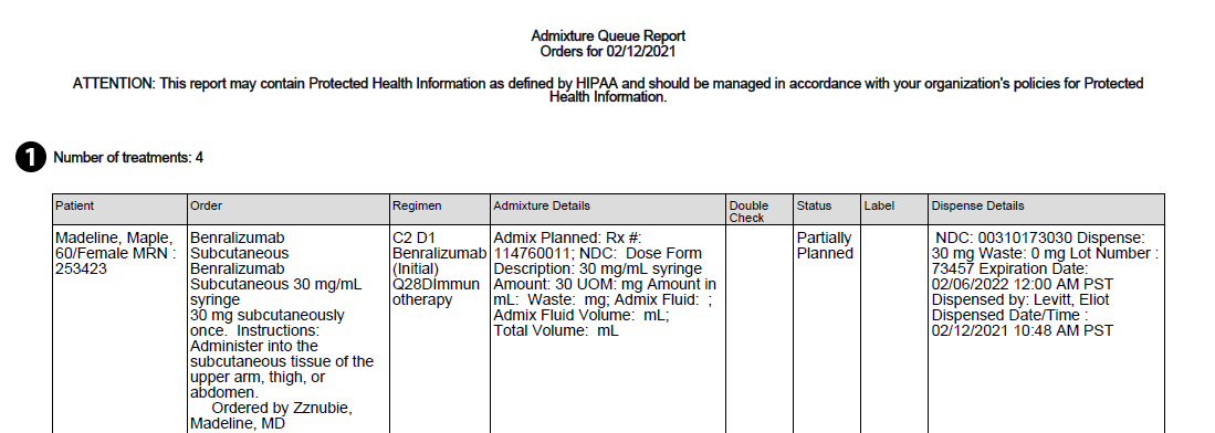 As requested by several practices, the Admixture Queue Report now shows a count of the Number of treatments ordered on a particular day (see callout 1). Please note that two orders combined into a single bag count as one treatment.