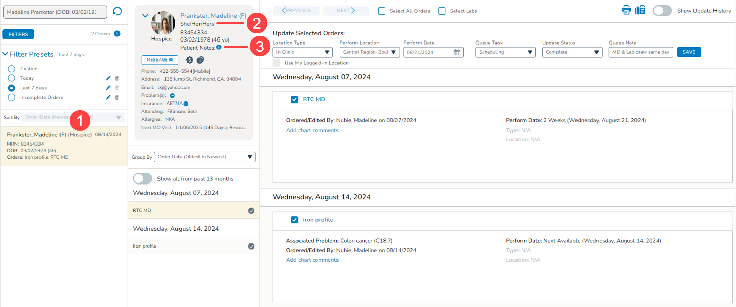 After this release, the patient details within the Orders Queue will include this important information so users can see the patient’s hospice status, preferred pronouns, and patient notes, reducing the need to open the patient chart and streamlining the review process (callouts 1-3).