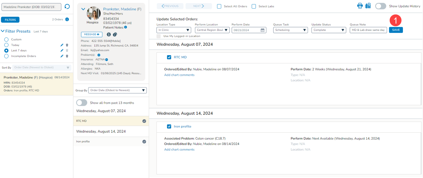 We’re optimizing the order workflow by consolidating several key steps. Users can now assign or update the order’s Location Type, Perform Location, Perform Date, Queue Task, Status, and Queue Note, and use one Save button to apply all the updates (callout 1). This reduction in clicks accelerates order processing and improves overall workflow efficiency.