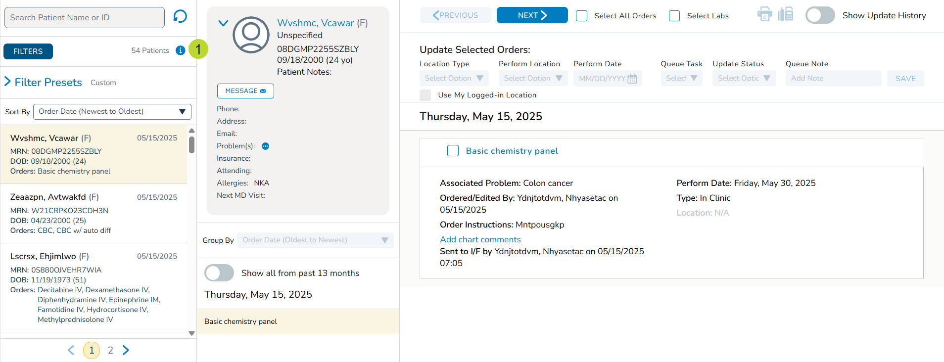 You’ll now see the number of patients (instead of the number of orders) that match your current filter criteria displayed in the far-left column of the Orders Queue (callout 1). This change boosts queue performance, as retrieving the patient count is much faster than counting individual orders.