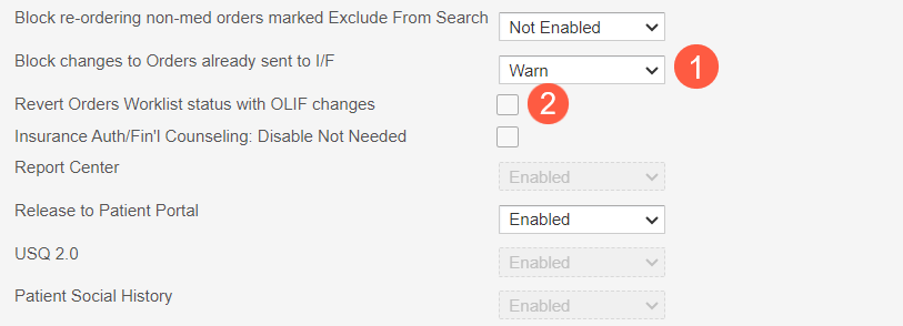 The Block changes to Orders already sent to I/F practice preference works in the Orders Queue as it does in the traditional Orders Queue (callout 1).