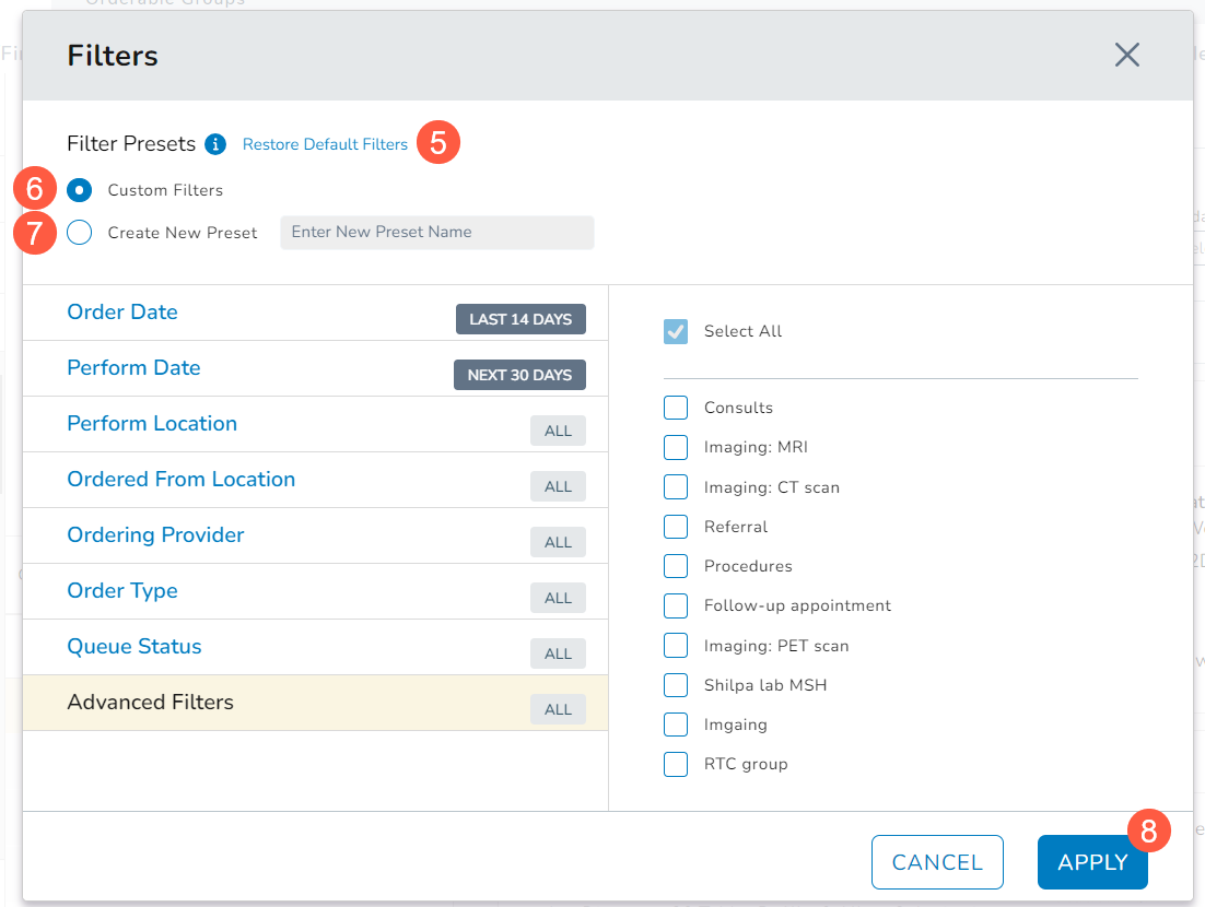 - Create New Preset to customize your view for this session and save it to be used in future sessions. You must choose a unique name for this filter (callout 7).