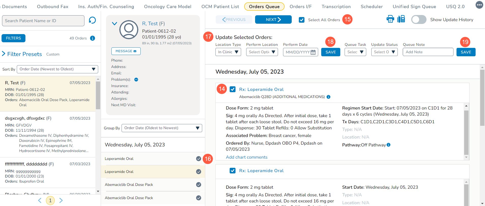 NOTE: When selecting orders from the far-right column, review the corresponding checkbox in the middle column (callout 16). It is important to maintain an awareness of this when applying updates to ensure you’re changing the correct order.