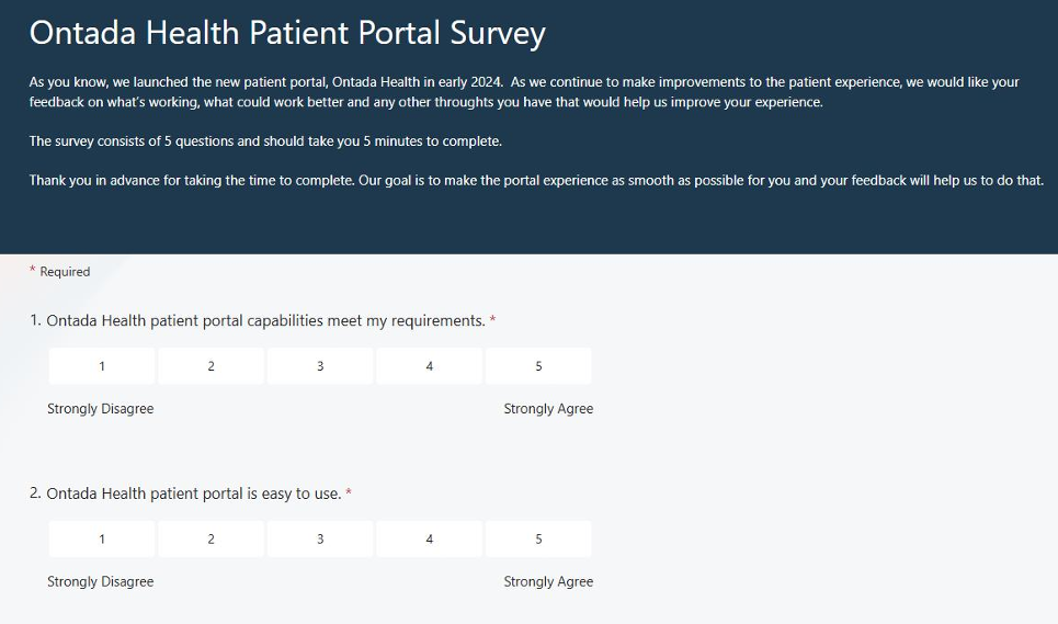 As part of this release, patients can access a feedback survey within the patient portal. This survey helps us gather direct input from patients about their experience using Ontada Health. Their feedback will be used to identify pain points, improve usability, and guide future enhancements.