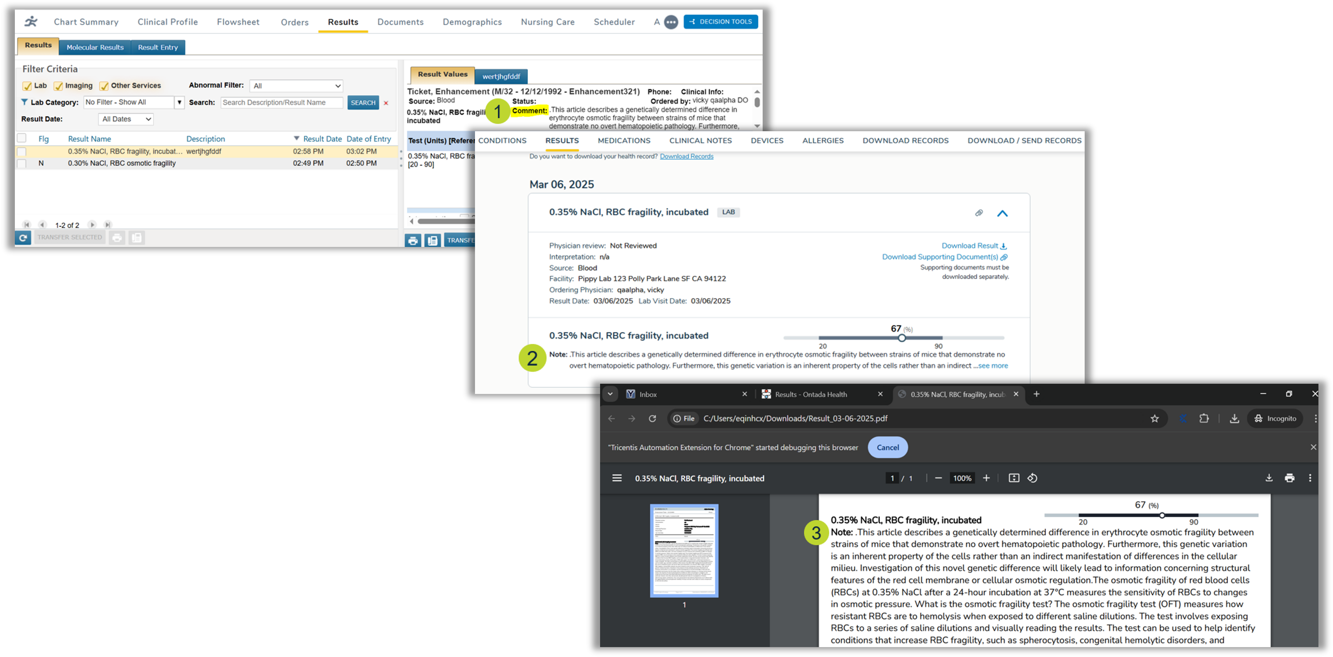 With this update, comments entered in iKnowMed (callout 1) and comments included with results from other locations, will now be displayed as follows:
