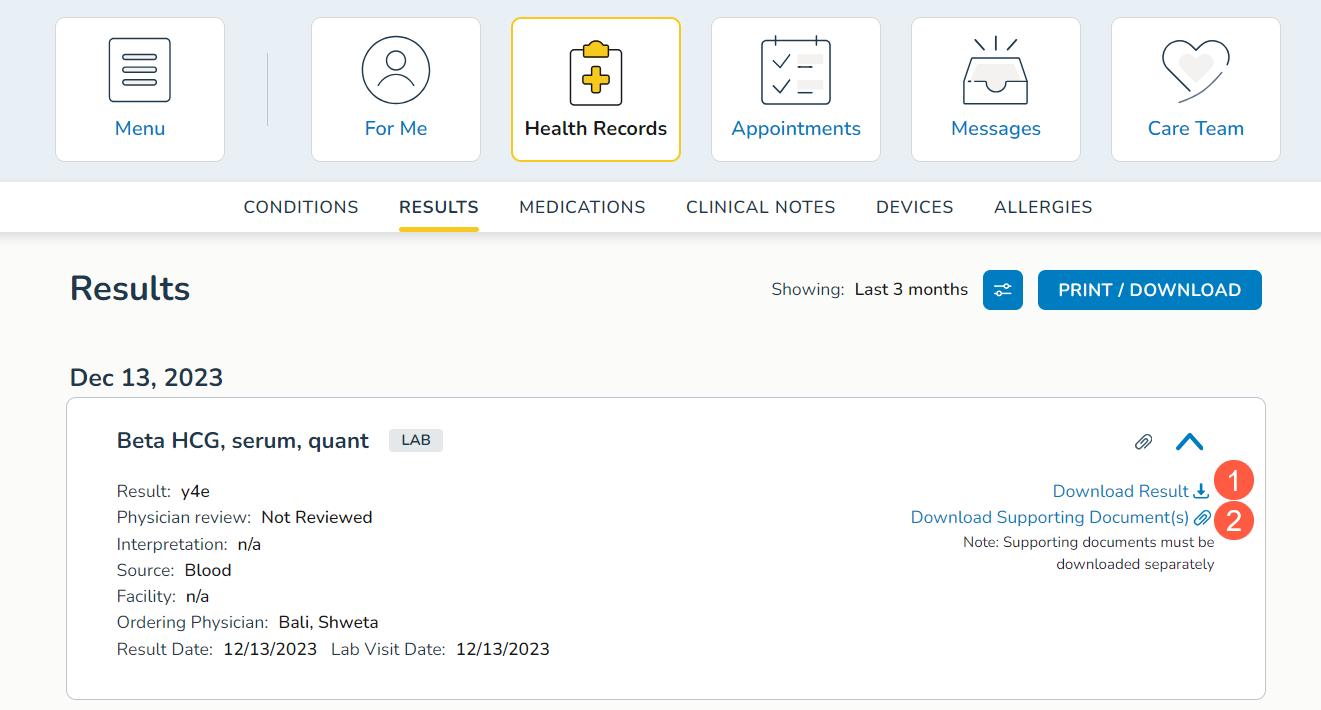 - The downloaded PDF contains all the details available in the patient portal, ensuring a comprehensive overview of the result.