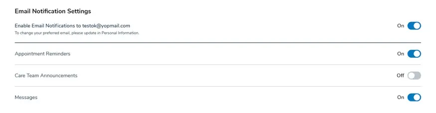 Upon confirmation, the new Care Team Announcements setting will automatically toggle off in the patient’s My Account > Email Notification Settings. Patients can re-enable announcements anytime by toggling this setting back on.