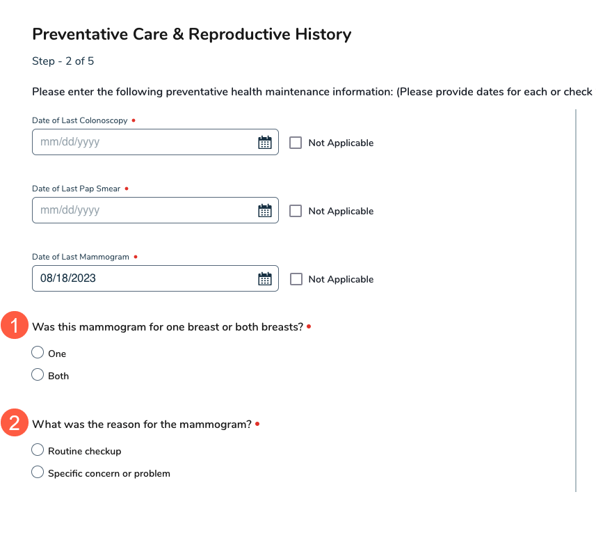 Now when completing the Preventative Care form, if a patient indicates they had a mammogram, they will be presented with two follow-up questions to provide more details regarding the screening (callouts 1 and 2).