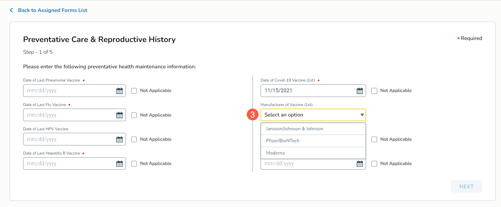 If a patient indicates they received the COVID-19 vaccine, they will be required to indicate the manufacturer of each vaccine. They may choose from Janssen/Johnson & Johnson, Pfizer/BioNTech, or Moderna (callout 3).