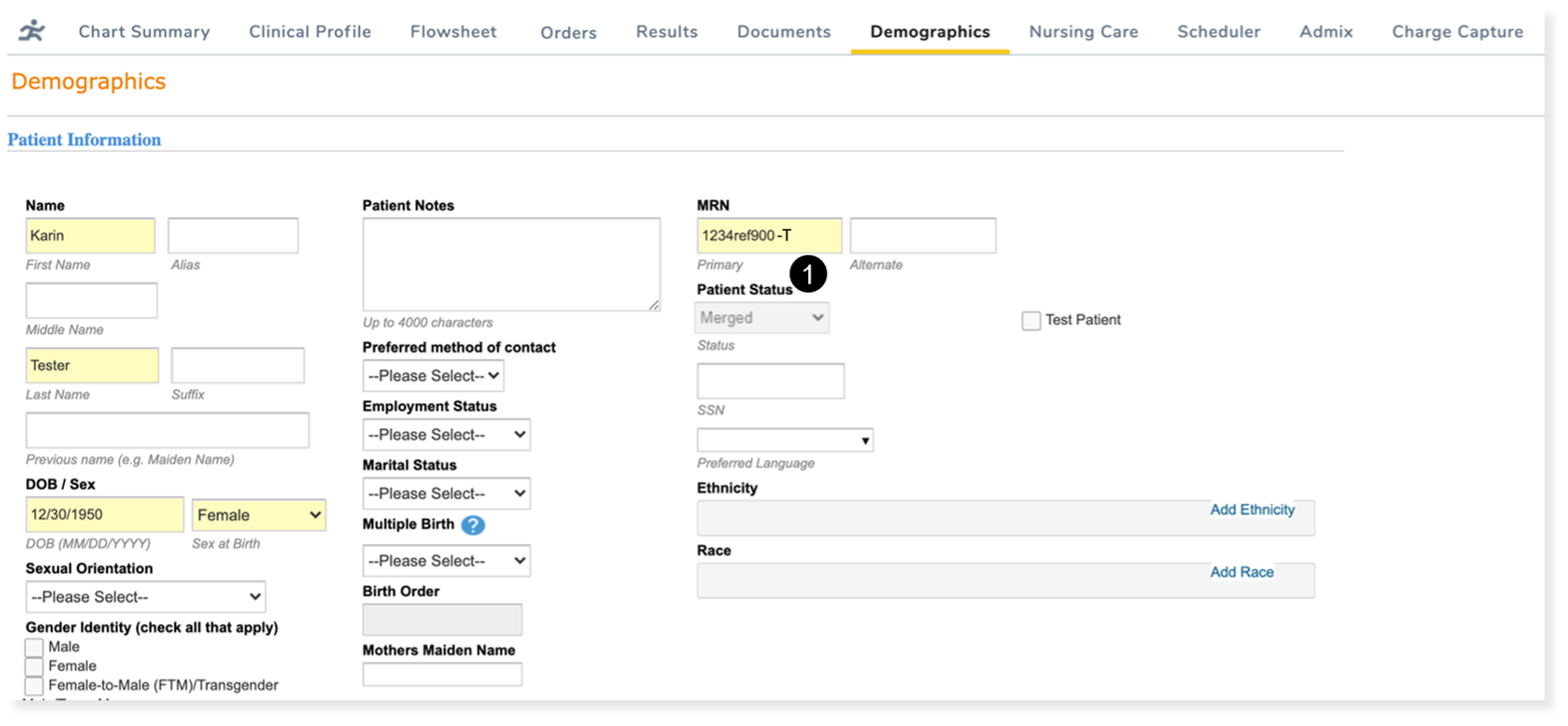 To prevent users with permission to view and edit Target and Source charts from changing this status, the Patient Status drop down is now read-only when set to Merged during the chart merge process (see callout 1).
