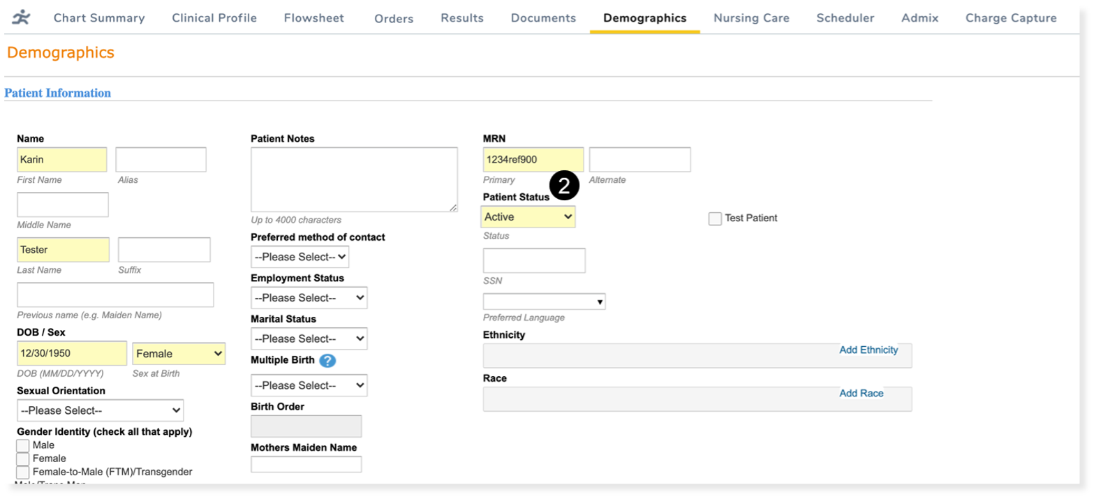 The Patient Status of final charts from chart merge process can still be updated as needed (see callout 2).