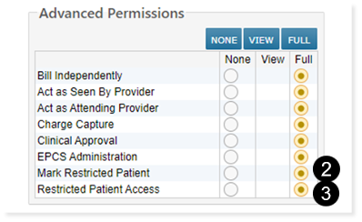To view restricted patient charts, users must have new Restricted Patient Access permission (see callout 3).
