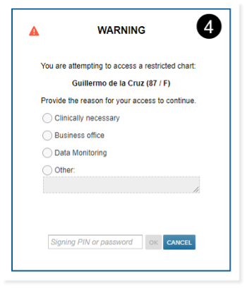 When accessing restricted patient charts, users with the Restricted Patient Access permission must enter a reason for accessing the patient, as well as their current pin or password (see callout 4).