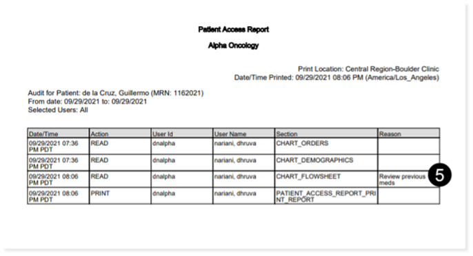 The Reason for accessing the patient will be logged and accessible via Flowsheet > Patient Access report or Admin > Users > User Audit Report (see callout 5).