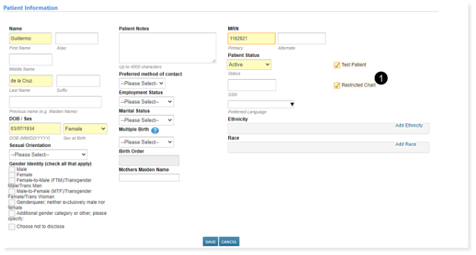 A new Restricted Chart designation has been added to patient Demographics to signify that the patient should only be accessed by authorized personnel (see callout 1).
