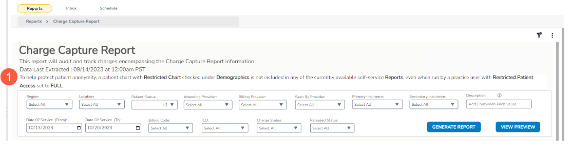 “To help protect patient anonymity, a patient chart with Restricted Chart checked under Demographics is not included in any of the currently available self-service Reports, even when run by a practice user with Restrict Patient Access set to FULL.”
