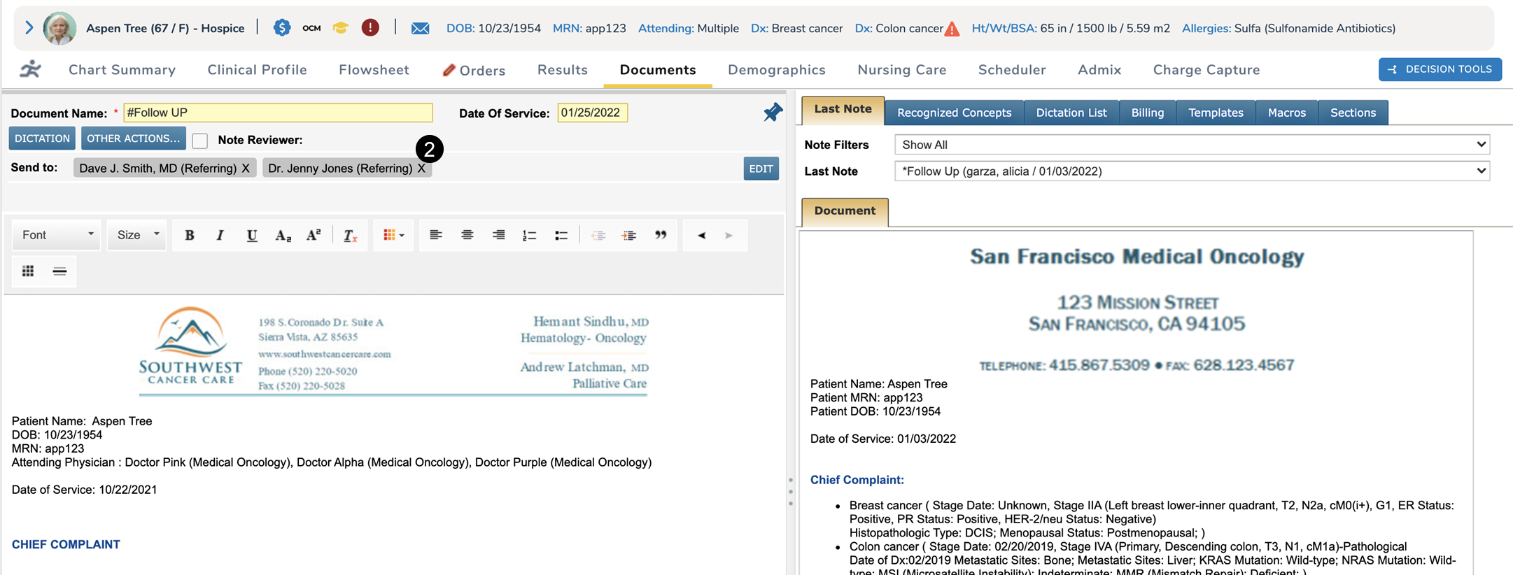 The first time a note is created post-release, users must still add their intended recipients. After the initial note is signed and sent, the copy forward feature activates, and those same recipients will be automatically added to subsequent notes in the Send to line (see callout 2).