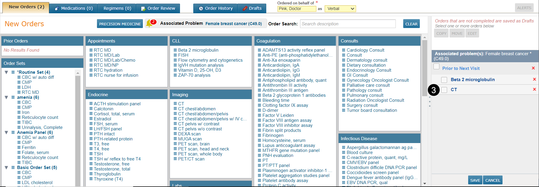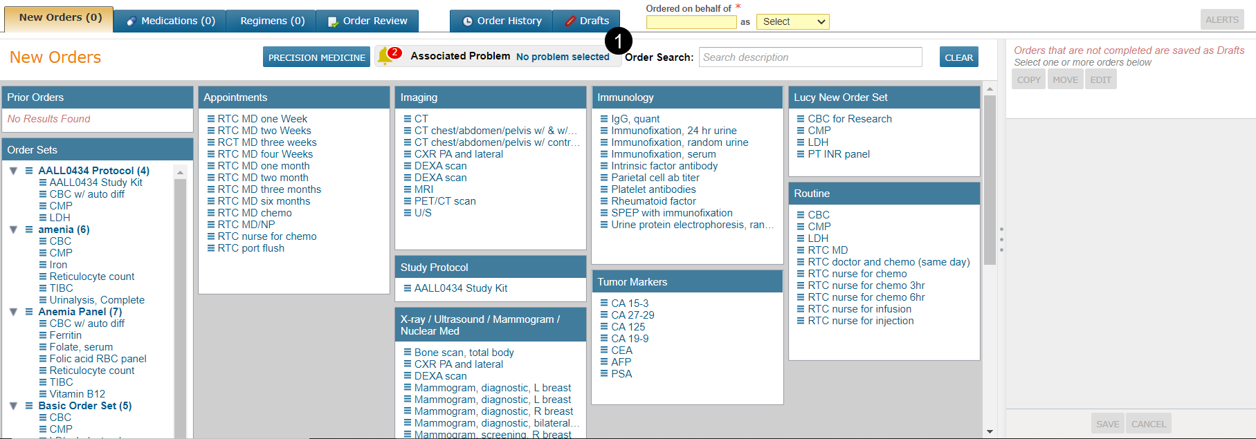 On the Orders tab, you can save clicks by selecting more than one Associated Problem for orders you are about to create (see callout 1). Before this release, only one problem could be selected from the Problems dialog. Check boxes have been added so that you can now select all, select one, select multiple, or select none (see callout 2).