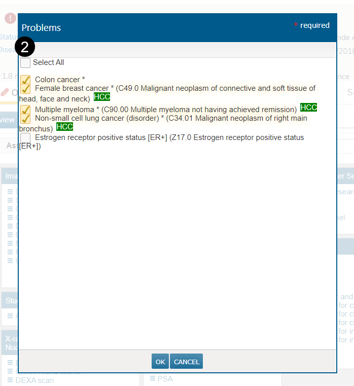 EXAMPLE: If the patient has multiple principal diagnoses, each will be pre-checked in the Problems dialog. You can open the dialog to confirm which diagnoses apply to the orders you are about to create.