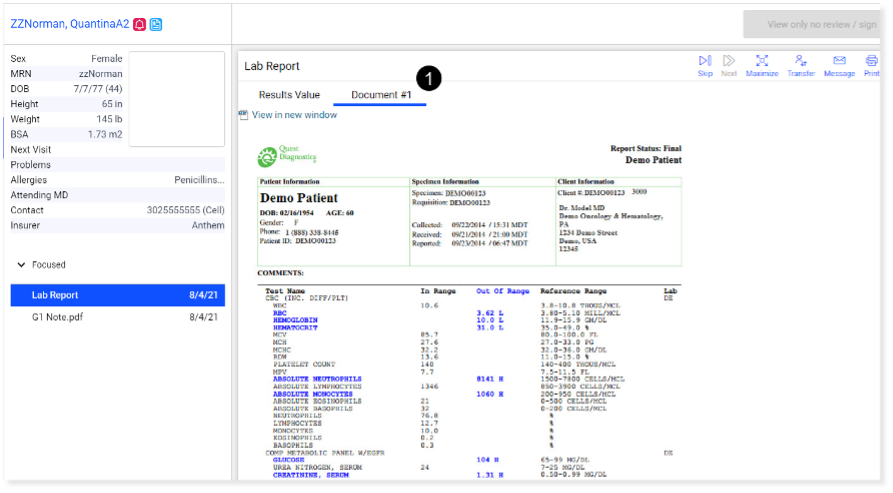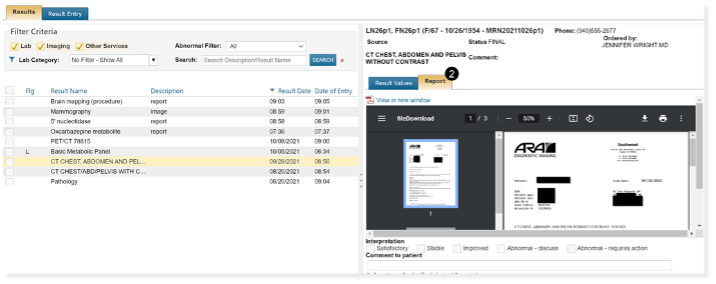 We’ve enhanced the Unified Sign Queue, the Lab and Imaging queues, and the Results tab to automatically display attached PDFs for lab and imaging results, presenting practices with more detailed information at first glance (see callouts 1 and 2).