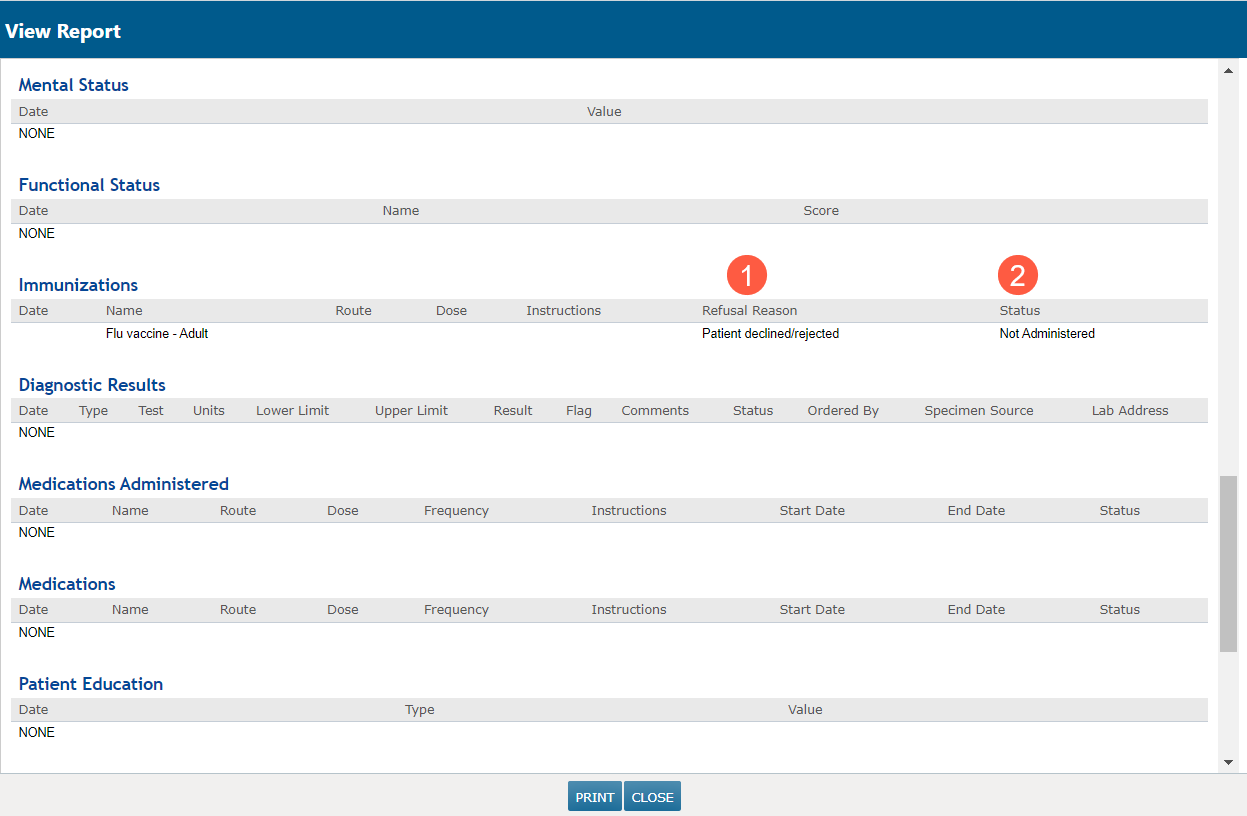 The CCDA now displays a Refusal Reason and Status for immunizations documented in Clinical Profile > Health Maintenance (callouts 1 and 2).