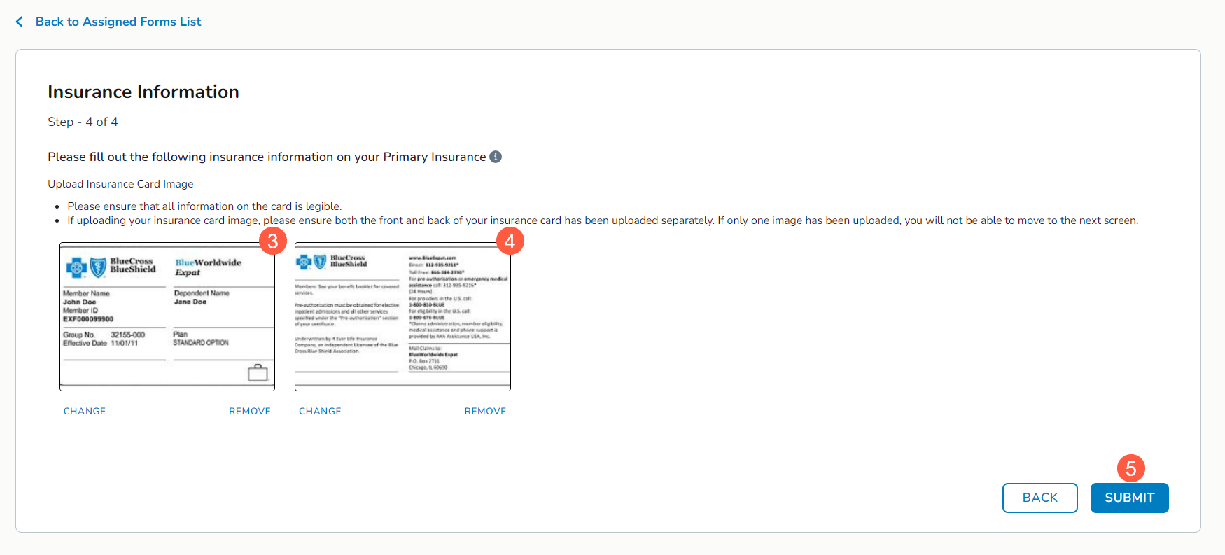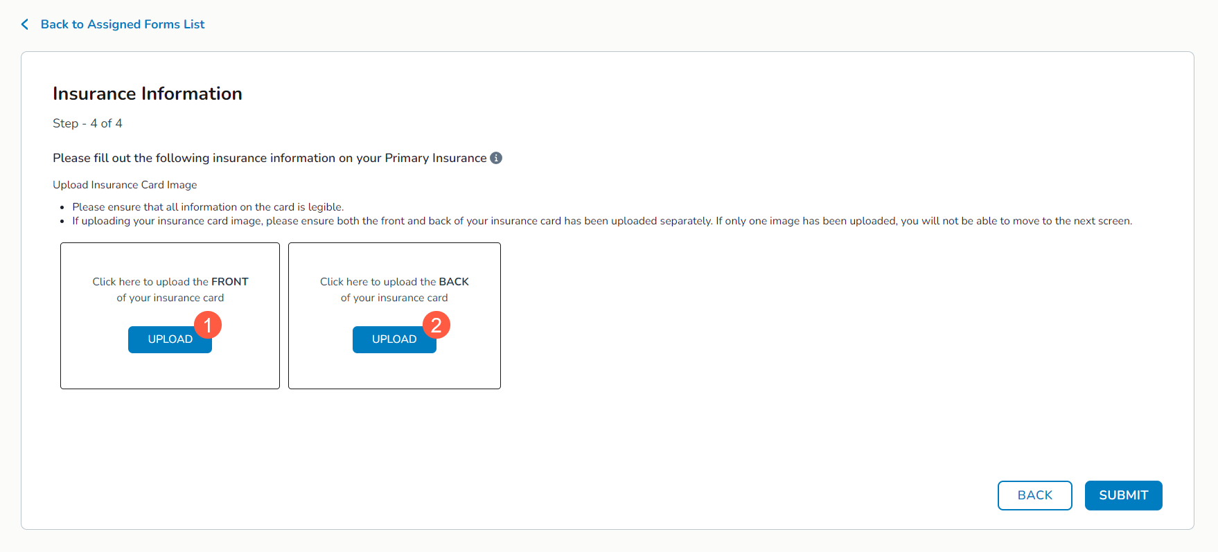 - After entering their insurance information, they will be prompted to upload insurance card images for each insurance entered in the form, e.g., primary insurance, secondary insurance, and/or prescription drug coverage.