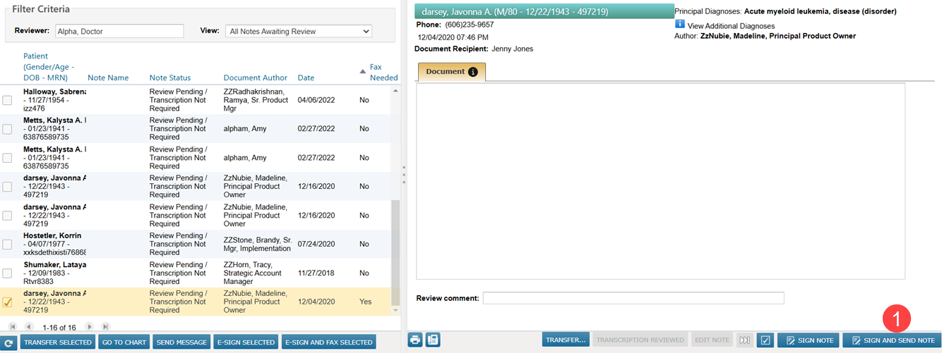 - New Button Label: The action button has been retitled from “SIGN AND FAX” to “SIGN AND SEND” (callout 1) to indicate that users now have the flexibility to send the note via fax or direct exchange, depending on the provider’s contact preferences.