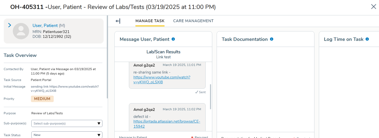 Practice users can view and click these links directly in the message through the admin tools (e.g., in the task). The link will open in a new browser window, allowing users to access the resource while keeping the task open.