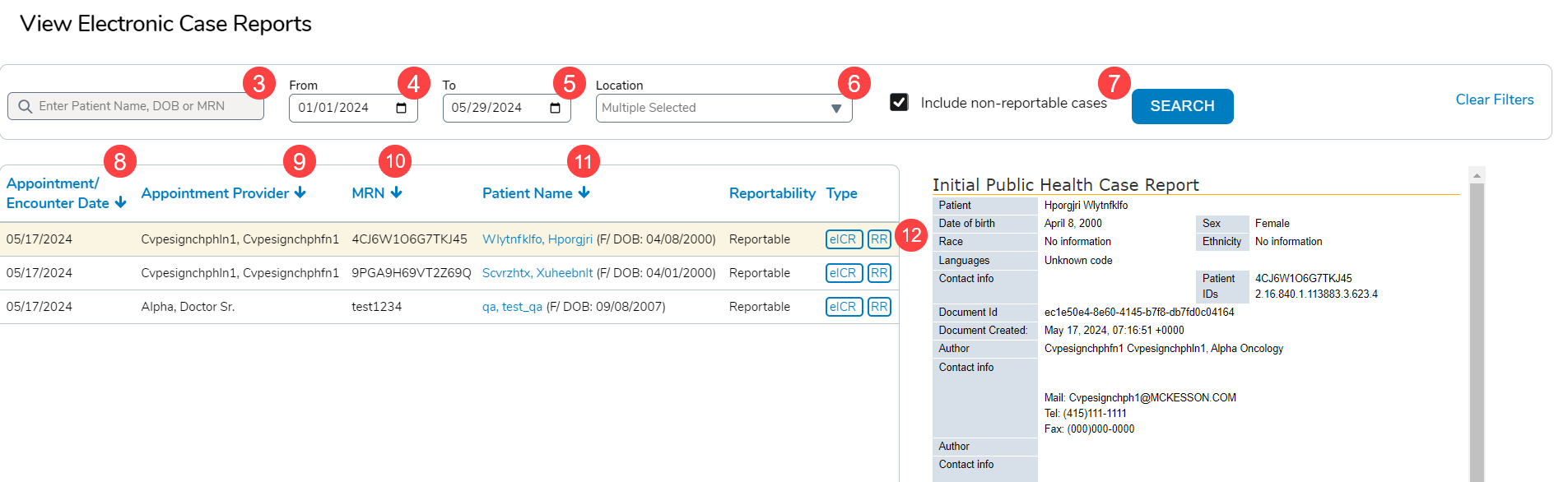 - Filtering and Searching: Use filters to search for patients by Name/DOB/MRN, date range (To and From), and Location to populate the results table. You can also choose to include non-reportable cases (callouts 3-7).