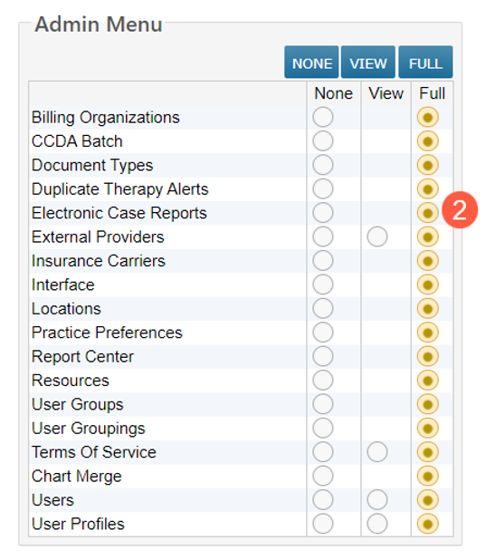 - User Permissions: Individual users must have permission to access electronic case reports. Under the user’s Permission settings, set the Admin Menu > Electronic Case Reports permission to Full (callout 2).