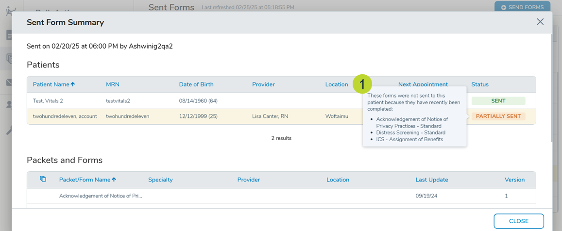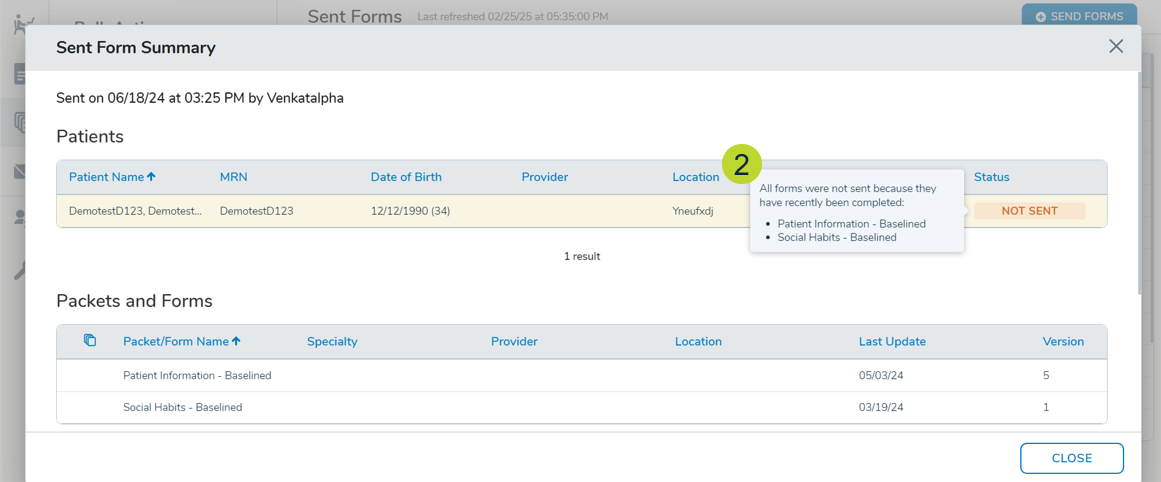 - Hover message: “All forms were not sent because they have recently been completed: Form Name, Form Name…”