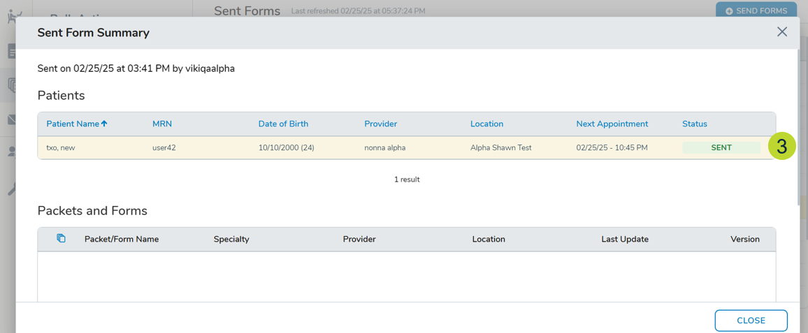 - The Sent Forms Summary window when sending forms from the Sent Forms page, in a new Status column in the Patients table.