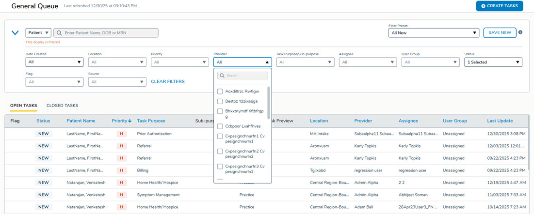 Provider dropdowns in General Queue, Forms Queue, Send Forms, Send Announcements, and task management now display only healthcare providers and staff.