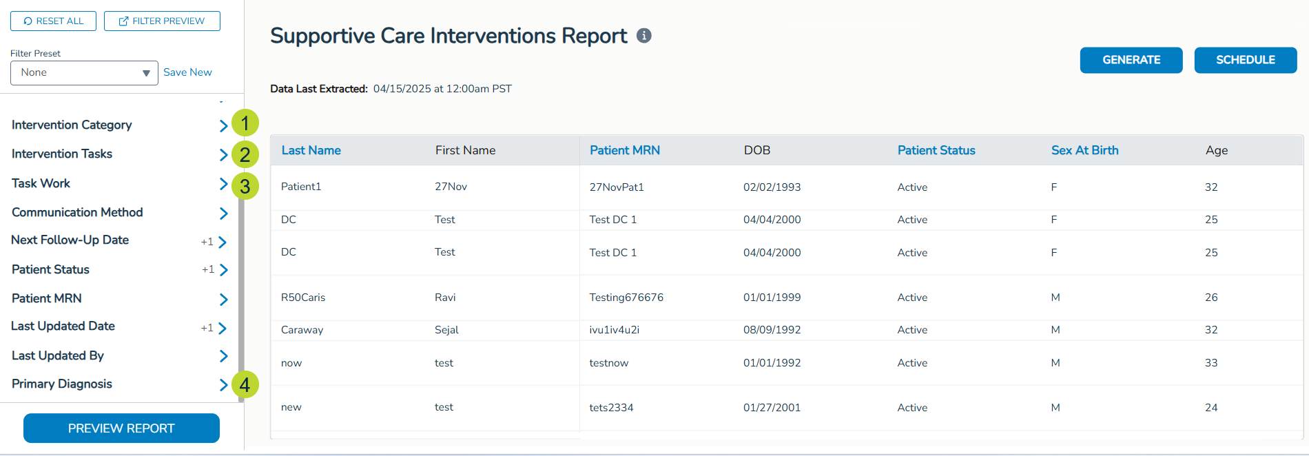The Supportive Care Interventions Report will allow for more granular control over your report with four new filters (callouts 1-4):