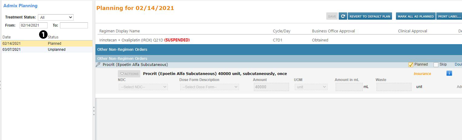 For example: a patient is on a regimen that has been suspended. Prior to the regimen being suspended, the admixtures were partially planned. The patient also has an order for a drug that is not a part of a regimen. If the drug outside of the regimen has been planned in admix, the status will show as planned. The status of the suspended regimen will be ignored.