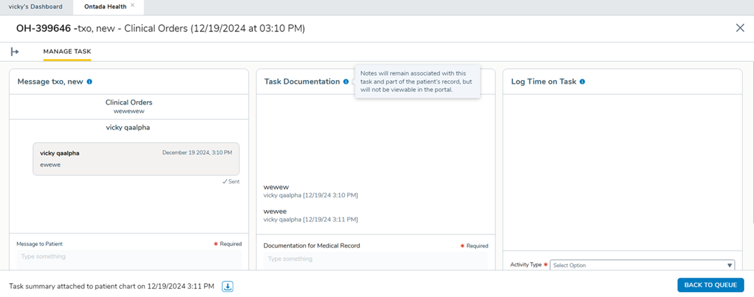 Previously, the tooltip next to the Task Documentation section stated: “Notes will remain associated with this task and part of the patient’s record, but will not be viewable by the patient.”