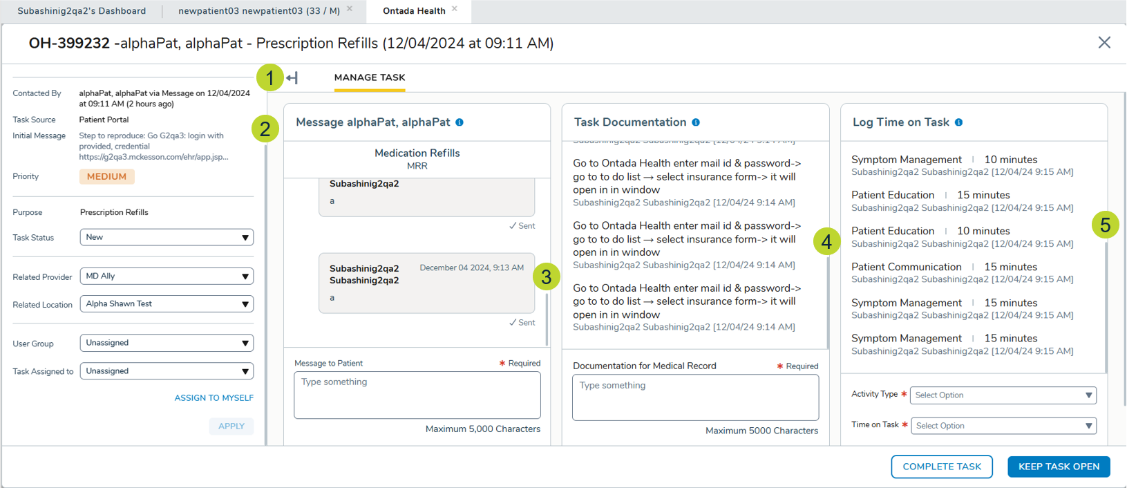 - Messaging, Task Documentation, and Log Time On Task areas (callouts 3-5).