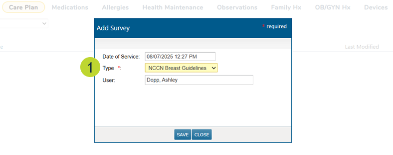 - When adding a care plan to the patient’s chart, choose the NCCN Breast Guidelines option as the care plan Type (callout 1).