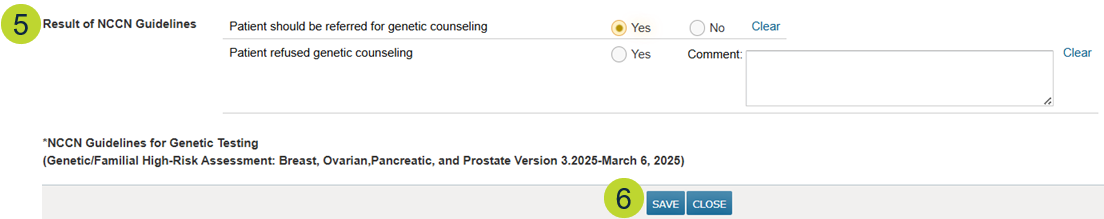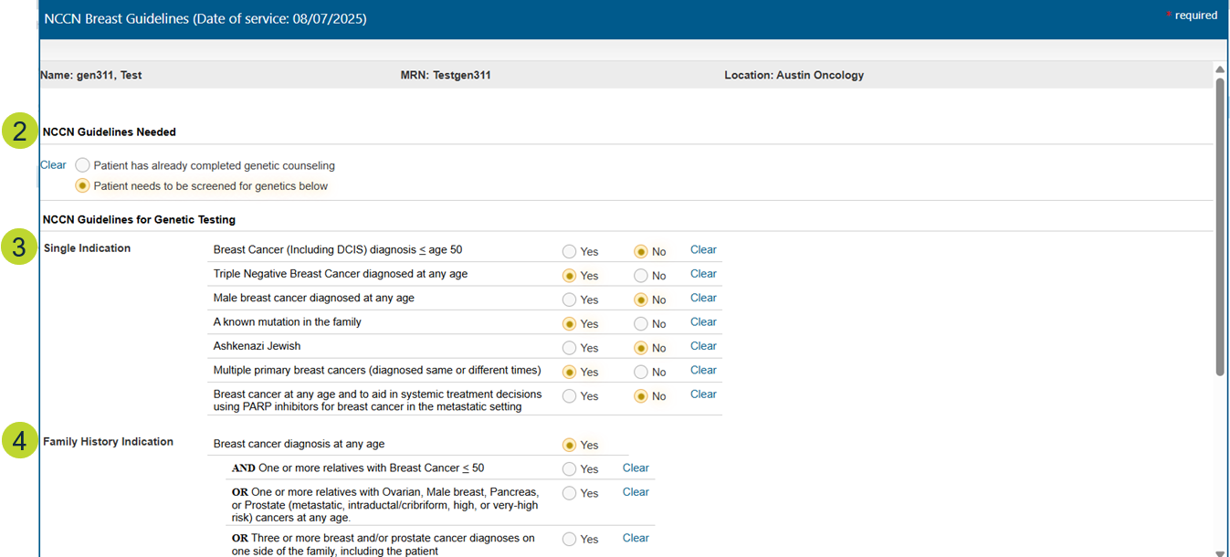- Under the NCCN Guidelines Needed section, document whether the patient has already completed genetic counseling or needs to be screened based on the assessment (callout 2).