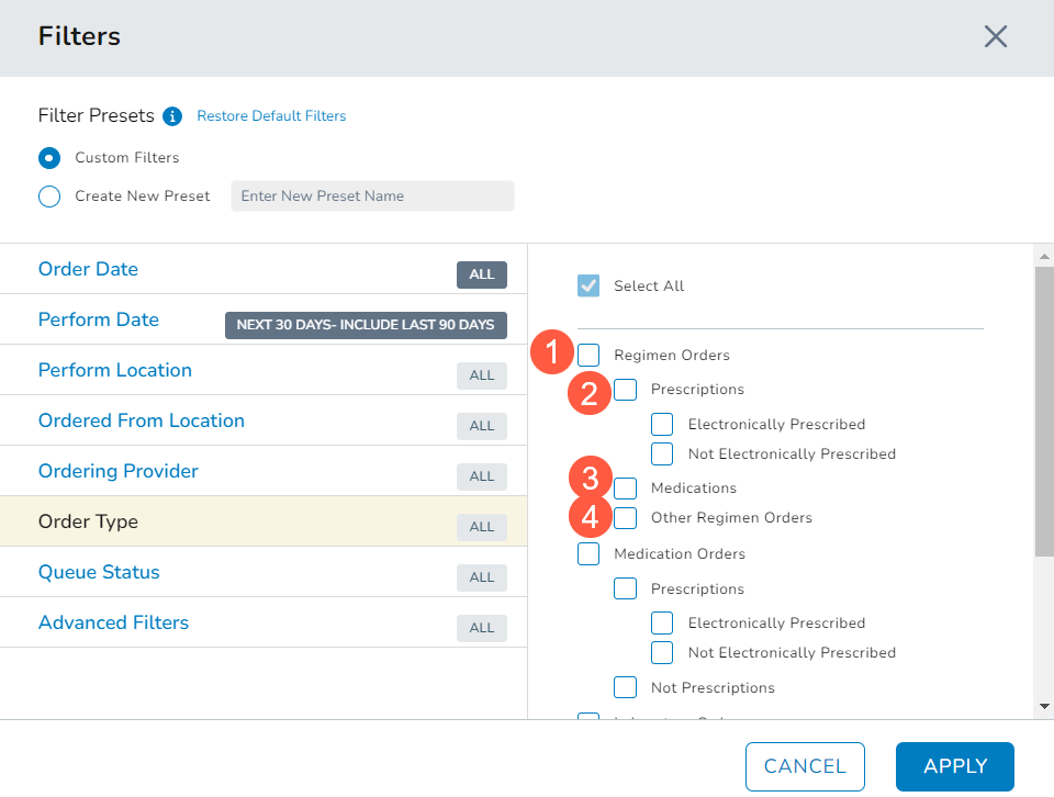The Order Type filter options have been expanded to include an improved Regimen Orders filter (callout 1).