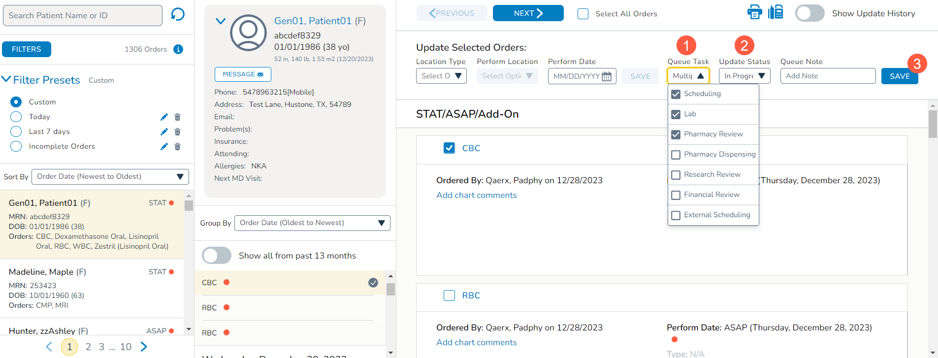 Simply select an order then use the updated Queue Task drop-down to select multiple tasks (callout 1). Use the Update Status drop-down to apply the same status to these tasks (callout 2) and Save your changes (callout 3).