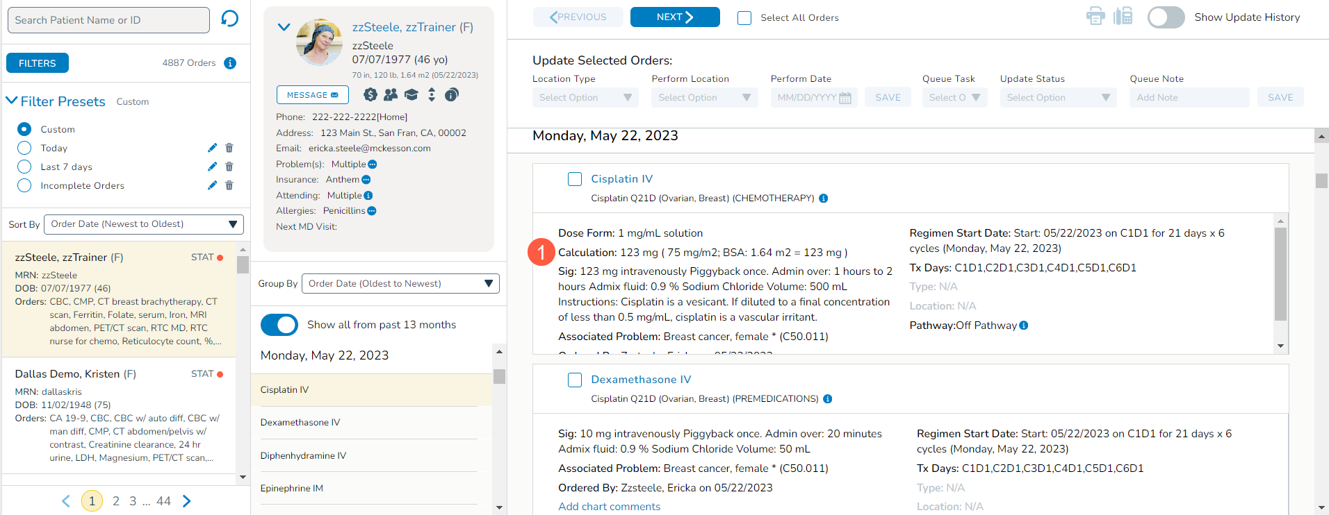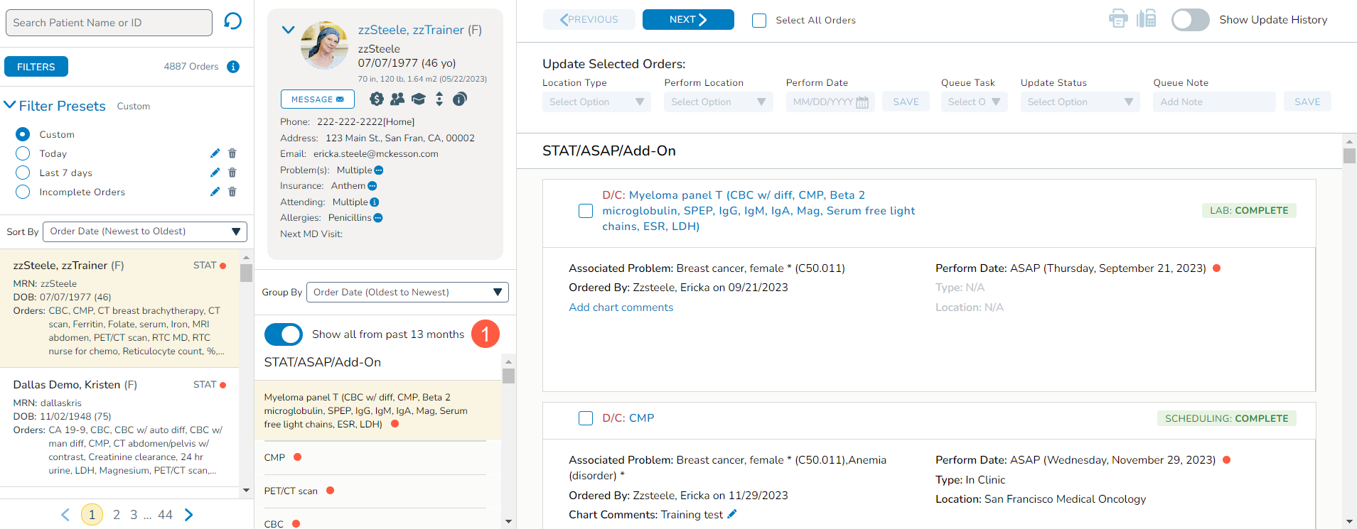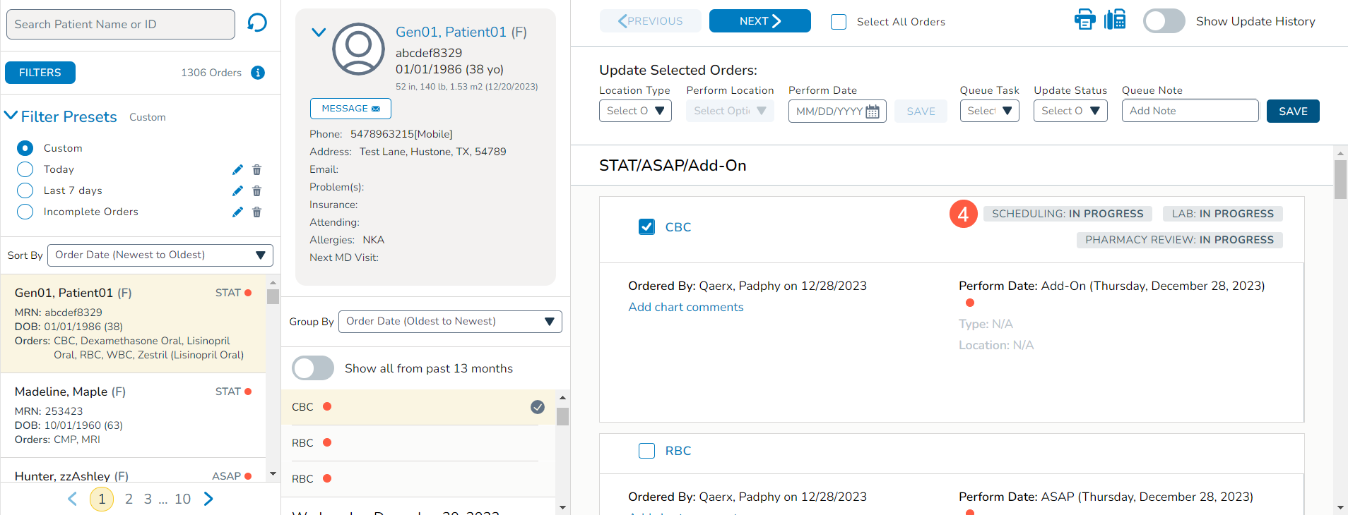 A new Show all from past 13 months toggle in the middle column (callout 1) enables users to view a patient’s previous orders going back as far as 13 months and all future orders, even if they do not align with the current filter criteria. This feature ensures a comprehensive view of a patient’s order history for more informed decision-making.