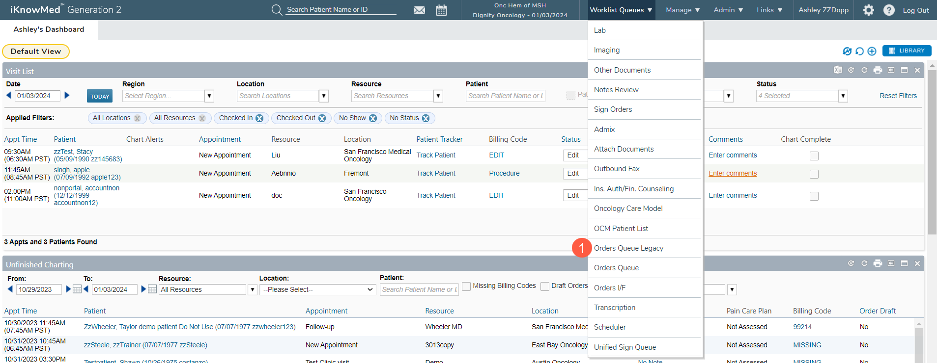 To facilitate a smooth transition to the new Orders Queue, practices will now have access to an Orders Queue Legacy worklist (callout 1). This resource allows users to verify the visibility of expected orders in the new queue.