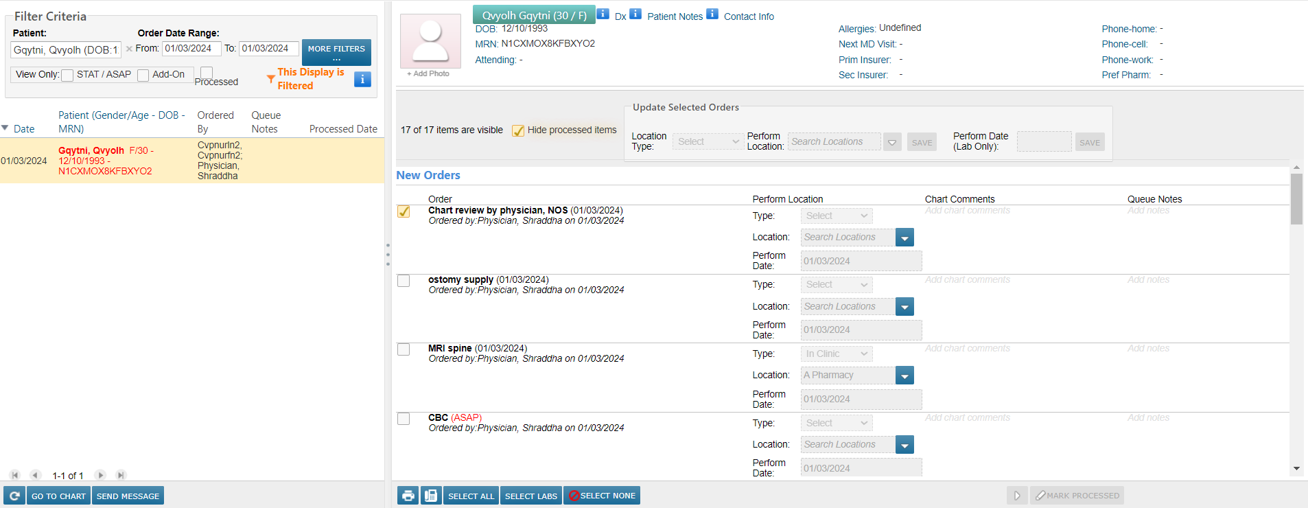 No updates to orders can be made from the legacy worklist. Orders can however be printed or faxed from this queue if needed.